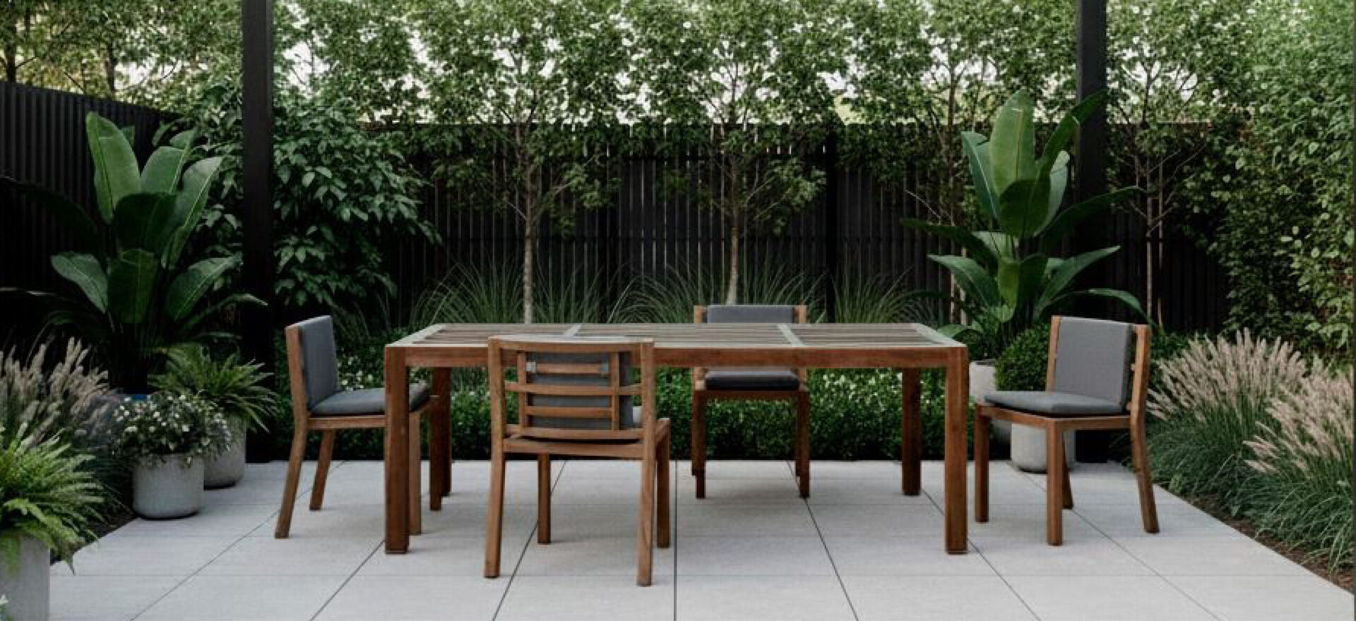 An entire furniture system for outdoor spaces has been developed on a highly versatile teak wood frame, available in three different finishes.