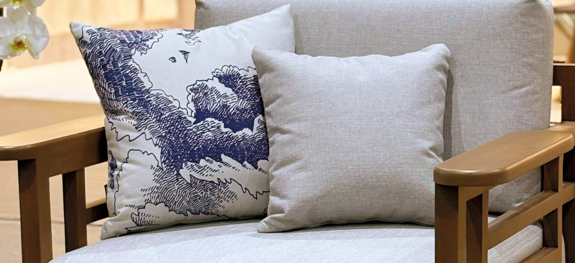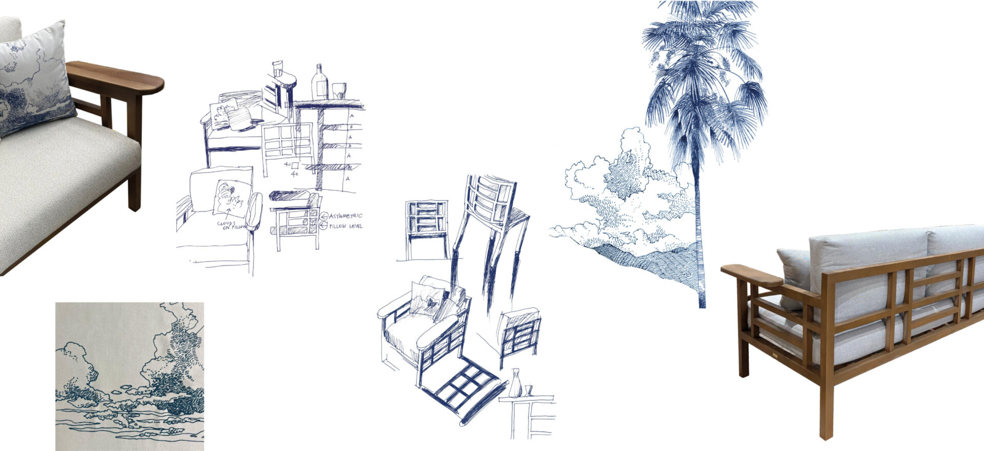 The very comfortable cushions are upholstered with specially designed fabrics featuring blue and white clouds.