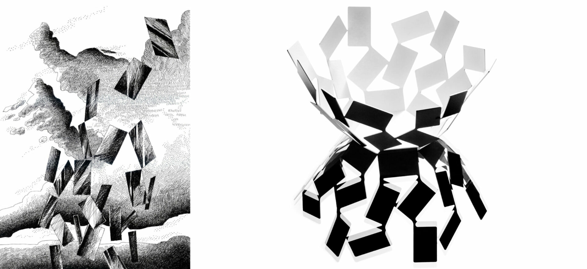 A family of objects for the table, which was born around the story of a magical and abstract place, where one is forced to stay and where everything is unstable: the room in which you lock yourself away to shelter from the sirocco, in traditional country houses in Sicily. It is a collection of arhythmic objects, composed of small splinters joined together by points in unstable equilibrium. They were designed starting from their shadows, stopping unexpected moments of fragments that the wind stirs in the air. Shadows that want to reach the edges of the table and go beyond, on the walls and ceiling, enormously large.